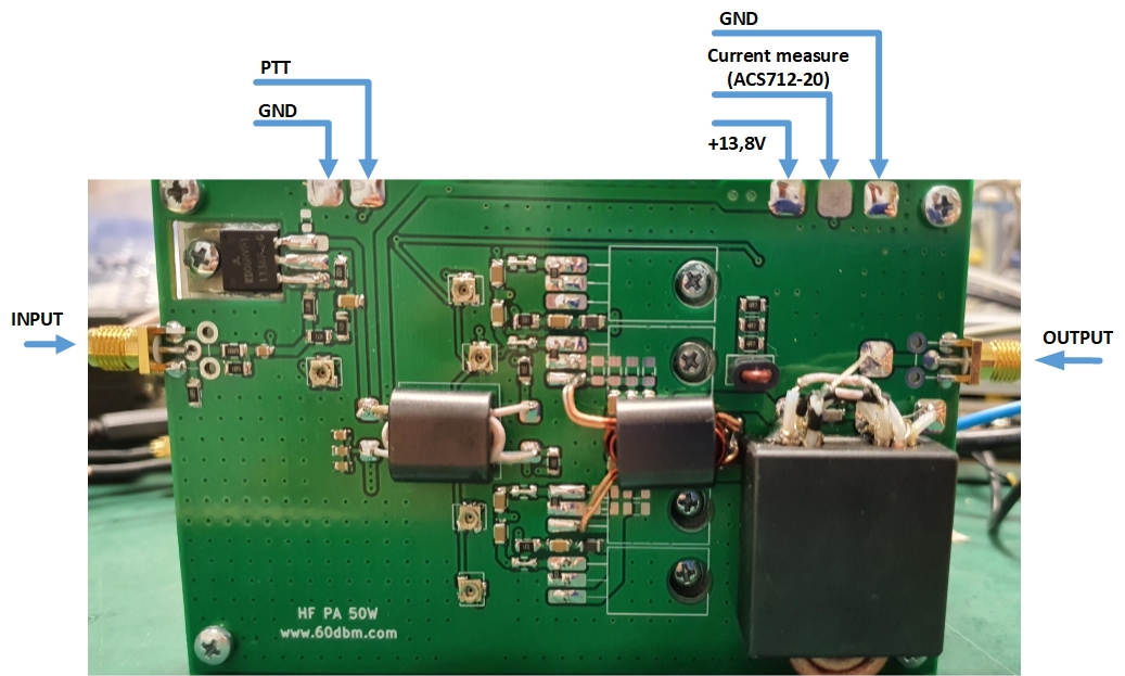 This is custom designed HF +50MHz amplifier with NO LPF onboard, 4x RD16HHF1 based, intended for field or mobile operations or as driver for LDMOS amplifier. This amplifier produced from high quality ORIGINAL parts, such as Mitsubishi transistors and AMIDON cores. PA PCB mounted on metal heatsink for good heat dissipation. PA has 3.5 dB flatness of frequency response.